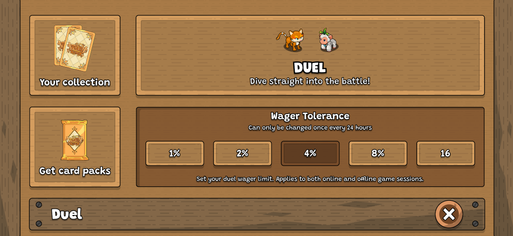 * E.g. If you have 10,000 pet points for example and the opponent has 1,000 pet points, the starting wager will be 10 pet points (1% of opponent's pet points). This can be progressively doubled until either your or opponent's wager tolerance is met.&#x20;