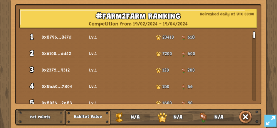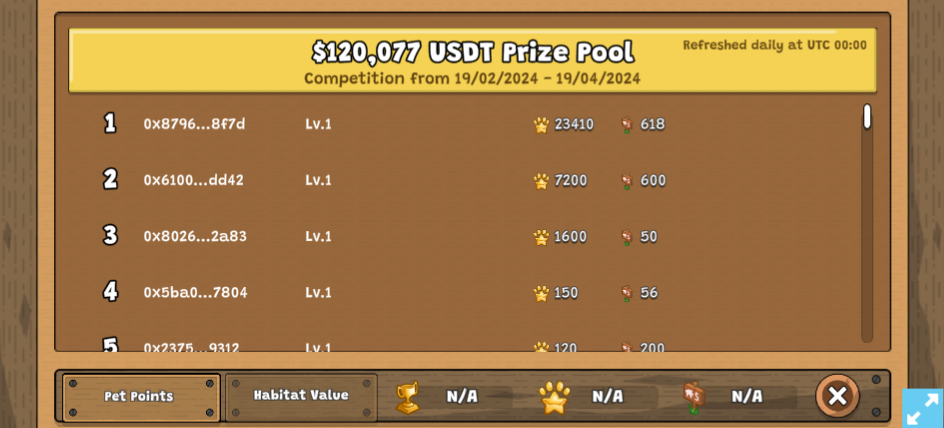 Note that the leaderboard rank & user's Pet Points and Habitat Value on leaderboard UI will be refreshed daily at UTC 00:00.&#x20;